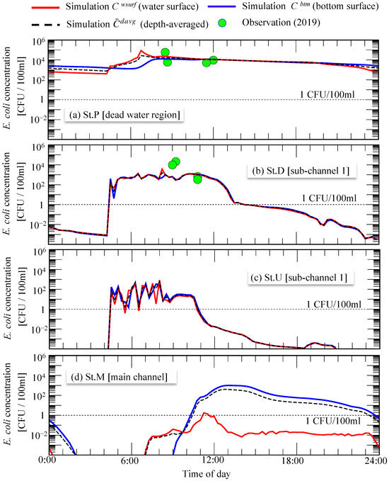 In addition to the calculated E. coli concentration, the observational data are indicated by green circles. The field measurement of E. coli was performed at the water surface around St. P and St. D on 14–15 March 2019, almost one year after the simulation period. Although the verification is not entirely accurate because the year differs from the simulation year, the observed data are in good agreement with the calculation results, and the simulation appears to calculate reasonable E. coli transport.