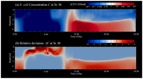 Here, we would like to illustrate the difference between the 3D model and 2D model. In comparison with the depth-averaged 2D model, although the 3D model needs a larger computational effort and takes more time, the 3D model has the advantage that the vertical profile can be grasped. In each panel of Figure 14, the diurnal change in , , and is shown by a red solid curve, a blue solid curve, and a black dashed curve, respectively. Because the depth-averaged concentration is the target variable that we could determine by applying the 2D hydraulic model, the deviation of and from suggests to us the expected difference between the 3D and 2D solutions. As shown in Figure 14b,c, at St. D and St. U, which are in the center of the shallow sub-channel 1, both and almost agree with . Generally speaking, it can be expected that the vertical profile of water flow and substances may be uniform in shallow water areas. Actually, it was found in the calculated results that the E. coli concentration tends to be uniform over a wide area, not just at St. D and St. U. However, in some areas where the flow velocity changes in a vertical direction due to topographic conditions, there was a large vertical deviation in the E. coli concentration that could not be ignored. As shown in Figure 14d, at St. M, both and drastically increase before noon and remain about 1000 times higher than throughout the afternoon. Figure 15 shows the temporal change in the vertical profile of E. coli concentration at St. M. In addition to the raw concentration C, a vertical profile of relative deviation , which indicates the difference from the depth-averaged concentration , is also shown in panel (b):