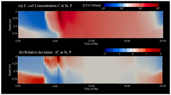 Diurnal change in vertical profile of (a) E. coli concentration C and (b) relative deviation at St.P on 7 March 2018.