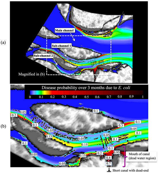 Figure 17 displays the disease risk map generated to assess the dangerous 3 months in the dry season. The probability that a person contracts a waterborne disease at least once over 3 months () is evaluated and illustrated on the map. The daily average was calculated from the E. coli concentration simulated by the 3D model. From the map, it can be seen that the disease risk clearly varies by location, even within the same village. In areas such as the center of channels where the water flow is relatively rapid, the probability tends to be relatively low. As illustrated in Figure 17b, even in sub-channel 1, where many houses are located, the probability at the center of the channel remains below 0.05. In contrast, in shallow areas along the shoreline where the flow tends to be slow due to bottom friction, the disease probability increases, reaching several times higher. In particular, around the mouth of the dead-end canal illustrated at the bottom right of Figure 17b, due to stagnated flow, the disease risk drastically rises, with the probability ranging from 0.1 to 0.95. In the floating houses located in these high-risk areas, a member of a family is highly likely to contract a disease at least once during these 3 months, as a family consists of five people on average. In an interview, a father living in the village stated that he would have to spend half of his income on treatment if his child contracted a disease. As suggested by this interview, the high probability of disease in stagnated areas likely has a large impact on family life.