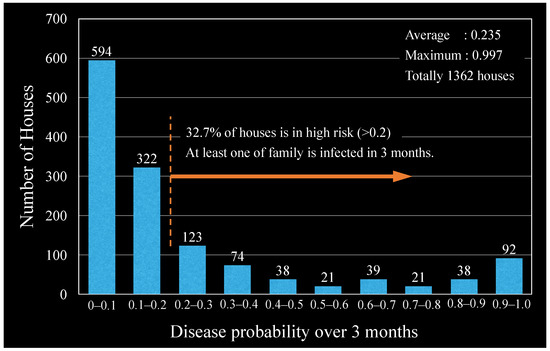 The probability of disease varies widely, ranging from 0 to 0.997 depending on the location of each house. As illustrated in the frequency distribution (Figure 18), among all houses in the village (1362 houses in total), the majority (67.3%) of the houses are located in relatively safe areas where the disease risk is below 0.2, while 32.7% (446 houses) are located in dangerous areas where the disease probability exceeds 0.2 and at least one of five family members will contract a disease within 3 months. This observation suggests a simple practical policy in which the probability of disease can be reduced to less than 0.2 by simply relocating 32.7% of the houses from high-risk areas to low-risk areas where the probability is less than 0.2. In a trial calculation assuming the execution of this relocation policy, the average disease probability was reduced from 0.24 to 0.12. Assuming that there are five family members in each house, this reduction signifies that the number of patients can be reduced from 1634 to 817 in 3 months.