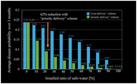 Installing a public service to deliver safe water to the residents is the third possible policy. In this scenario, a public water treatment facility is installed in a designated floating house, and safe treated water is delivered via water containers so that residents can switch from drinking lake water to drinking treated water. We recalculated the disease probability after starting the public service by reducing in Equation (20), which represents the volume of lake water used for drinking. As the installed ratio, which denotes the proportion of delivered safe water in the total volume of drinking water used in the village, we assumed ratios ranging from 0% to 100%. Figure 19 illustrates the changes in average disease probability depending on the installed ratio. The color of the bar charts represents different schemes for delivering safe water to floating houses. Blue bars represent the even delivery scheme, in which the same amount of safe water is distributed to all houses evenly, while green bars represent the priority delivery scheme, in which houses in higher-risk areas are prioritized and safe water is distributed in order of disease probability. As illustrated in Figure 19, in both schemes, the disease probability decreases as the installed ratio increases. However, in the even delivery scheme, the reduction speed is lower than that in the priority delivery scheme. This is because residents in all houses, even those located in highly polluted areas, must continue to drink dangerous lake water if the installed ratio is even slightly below 100%. In contrast, as indicated by the green bars, by employing the priority delivery scheme, the disease risk is drastically reduced, even with a small installed ratio. With a 20% installed ratio, the priority delivery scheme reduces the average disease probability from 0.24 to less than half that (0.09), whereas the reduction in the even delivery scheme is small (from 0.24 to 0.21). Based on this quantitative comparison, policy-makers can conclude that the priority delivery scheme is a crucial strategy for the success of the public water supply. Furthermore, because the disease probability after executing the policy is almost equal, policy-makers can conclude that the time-shifting policy is comparable to installing a treatment facility with a 20% installed ratio using the priority delivery scheme.