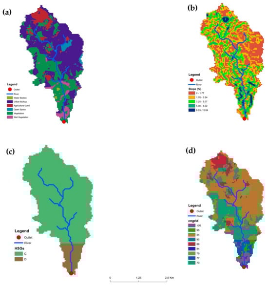 Characteristics of the Samaru watershed. (a) Land use of the study area, (b) slope, (c) hydrological soil map, and (d) curve number grid.