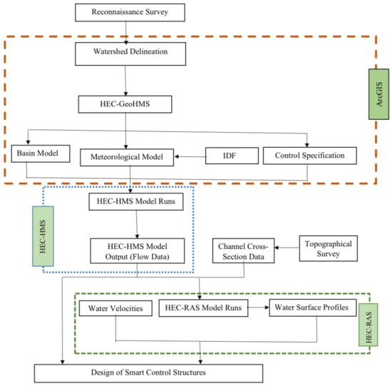 Storm water flows through an open channel with high velocity as runoff; this flow may be unsteady, non-uniform, or backflow-dependent upon the channel geometry, obstructions in the channel, catchment characteristics, and the amount of runoff from the catchment. High floods tends to erode channel bottoms, which may lead to channel bank collapse, as well as to modifications to the channel geometry [,,]. This usually results in spilling out of a reasonable quantity of water from the channel [,]. It is not possible for a natural or artificial waterway to remain unchanged during the urban development process because land use changes have a great influence on runoff generation [,,]. Residential and industrial development have been the main activities taking place in micro-watersheds. In most cases, the stormwater from an upper catchment is conveyed through an unlined natural open channel to the watershed outlets. Thus, some sections of these channels collapse, and several diversion channels are formed by the flowing water; as such, a reasonable quantity of water can be lost via these channels, and this can be coupled with evaporation and infiltration losses. It is anticipated that these losses could be so high as to result in inadequate discharges, which are unable to reach the outlet. Moreover, a flow conveyance structure along the channel is normally constructed to allow access, but it might be in danger of washing away or collapsing as water overflows its top when there is excess rainfall. Having said this, owing to the above concerns, it has become imperative to model the flow and optimize channel geometry in order to design preventive and control measures through which to limit water loss and the collapse of conveyance structures. This can only be achieved by carrying out detailed hydrologic and hydraulic modeling.