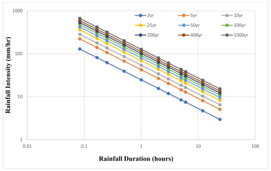 The intensity of precipitation (mm/h) for any time duration for all the respective return periods was calculated using Equation (12)
