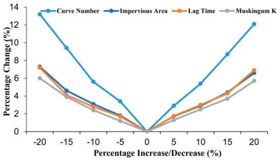 Model sensitivity analysis was conducted to determine which parameters of the model had a significant influence on the model output. The contribution of model parameters to an overall error in the model predictions was ranked with the aid of sensitivity analysis. Four (4) parameters of the model were subjected to sensitivity analysis. The curve number, impervious area, lag time, and Muskingum K were checked on a ±20% increment with a 5% interval. The curve number was determined to be the most sensitive parameter, as evident from Figure 5. An increase in the curve number by 20% made the peak discharge increase by 13.2%, and, when the curve number was decreased by 20%, the peak discharge was observed to decrease by 12.1%. The reason for it being the most sensitive parameter is that it depends on land use, hydrological soil groups, and antecedent moisture conditions, which are known to be the major influential factors in runoff generation. Lag time was also found to be sensitive as it tended to increase the peak discharge by 7.2% when increased by 20%, and it decreased the peak discharge by 6.8% when shortened by 20%. Figure 6 shows how these parameters deviated from the origin.