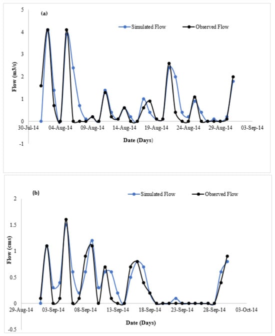 Simulated and observed hydrographs: (a) the calibration and (b) validation.