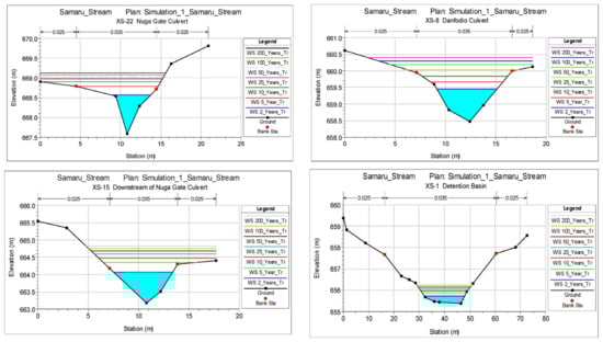 The cross-sectional water surface profile at the NUGA gate culvert, Dan Fodio culvert, downstream of the NUGA gate culvert, and the detention basin are shown in Figure 8. As seen from the cross-section at the NUGA gate culvert (XS-22), virtually all of the flows of different return periods produced a water surface profile that overtopped the main channel and the overbanks. Hence, this signified a flash flood or overtopping of the culvert.