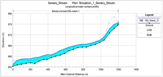 The longitudinal profile shows the variation of the water surface profile for each cross-section in the channel. Figure 9 shows the longitudinal water surface profiles for the floods in a 100-year period. The profile varies significantly from section to section, as seen from the figures, and this is evident because the natural streams usually have varying cross-sections.