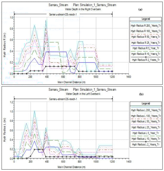 The water depth in the right and left overbanks for the different return periods is presented in Figure 10. The maximum water depth of the right overbank is about 0.9 m, while it is 1.0 m in the left overbank. Furthermore, it was observed that the water depth in both overbanks increased with an increase in the return period.