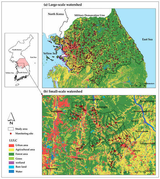 Monitoring sites and land use/land cover in the Han River basin. (a) Large-scale watersheds showing 3rd–4th-order stream basins and (b) small-scale watersheds showing 1st–2nd-order stream watersheds.