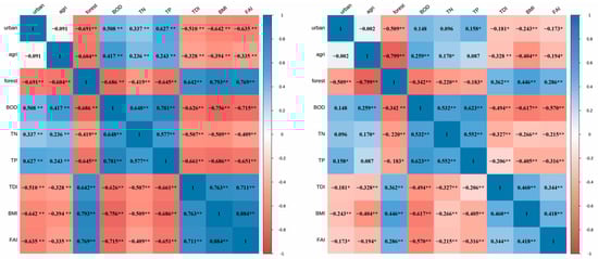 Relationships among biological indicators, water quality parameters, and land use in the large-scale watersheds (n = 177) (left figure) and small-scale watersheds (n = 157) (right figure) expressed as Pearson correlation coefficients (** p < 0.01, * p < 0.05).