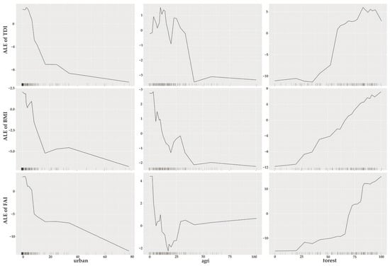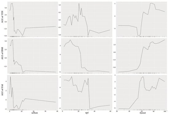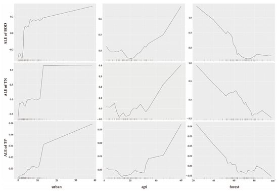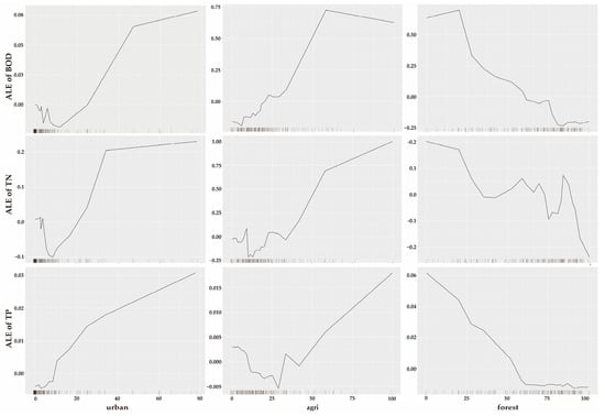 This study visualized the nonlinear relationship of land-use proportions with water quality and biological indicators using ALE main effect plots (Figure 3, Figure 4, Figure 5 and Figure 6). The ALE main effect plot showed that urban and agricultural areas have a negative effect on water quality and biological indicators on both watershed scales, while forest areas have a positive effect on water quality and biological indicators. In addition, the plot showed that the critical point of the impact of land-use proportion on water quality and biological indicators was different for different watershed scales.