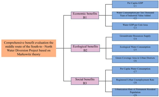 Under normal operation, the major goal of the project is to achieve the maximum comprehensive benefits with minimal risk by allocating different weights to different indicators, while considering the benefits of economy, society, and ecology. Based on the theories mentioned above and the actual operational needs of the project, nine indicators are selected in this model, including three indicators reflecting economic benefits B1—per capita GDP C1, water consumption per 10,000 yuan of industrial added value C2, and per m3 water GDP C3; three indicators reflecting ecological benefits B2—groundwater supply C4, ecological water consumption C5, and urban greening coverage C6; and three indicators reflecting social benefits B3—per capita water consumption C7, registered urban unemployment rate C8, and urbanization rate of permanent resident C9. The evaluation indicator system is shown in Figure 3.