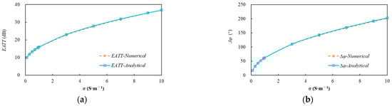 Figure 3. Comparison of analytical and numerical solutions of: (a) EATT and (b) Δφ. ΔL is set to 5 cm, and L1 and L2 are set to 30 cm and 25 cm.