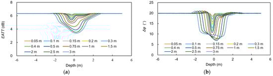 In Figure 7, the response curves of both EATT and Δφ are depicted for the coil systems with a DOI of 0.5 m, using a measurement frequency of 8 MHz. These curves represent the behavior of the coil system when different thicknesses of the target layer are present. It can be observed that both EATT and Δφ values in response to the target layer are smaller compared to the surrounding layer.