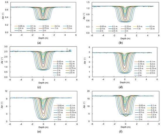 Figure 8. The Δ φ curves of the single-transmission dual-reception coil systems with the DOI of 0.3 m to the three-layer formation model at different frequencies: (a) 0.25 MHz; (b) 0.5 MHz; (c) 1 MHz; (d) 2 MHz; (e) 4 MHz, and (f) 8 MHz.