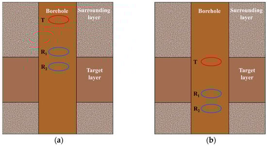 In Figure 11, a fixed frequency voltage signal is transmitted by T1 and received by R1 and R2 to obtain EATTR and ΔφR, and the recording point is the center of the two reception coils. Subsequently, the same frequency signal is transmitted by T2 and received by R2. The displacement of the tool can be ignored due to the short time difference between the two reception processes. Based on the induction signals received by R2 corresponding to the two transmission coils, respectively, another electromagnetic attenuation EATTT and phase difference ΔφT can be obtained at the center of the two transmission coils.
