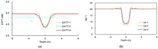 Figure 12 depicts the EATT and Δφ response curves of the dual-transmission and dual-reception coil system for a three-layer model with a DOI of 1 m and a measurement frequency of 8 MHz. The EATTT curve and ΔφT curve with subscript T are the measurement results of T1-T2-R2, while the EATTR curve and ΔφR curve with subscript R are the measurement results of T1-R1-R2. Averaging the two sets of data yields the measurement results of the dual-transmission and dual-reception coil system, which are shown as the red curves with subscript A in Figure 12.