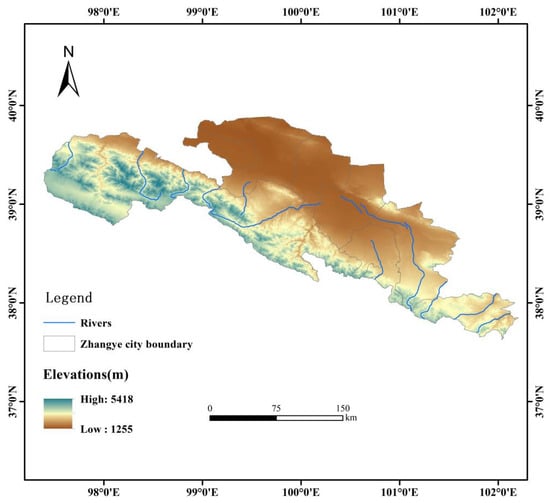 Zhangye (97°20′ E~102°12′ E; 37°28′ N~39°57′ N), a provincial municipality in Gansu Province, is located in the central part of the Hexi Corridor and the northern part of the Tibetan Plateau, as shown in Figure 1. Zhangye has a continental climate with a large temperature difference, dryness, low rainfall, an uneven distribution of annual precipitation, and high evapotranspiration. The national modern agricultural demonstration area is the region, from east to west, divided into three major water systems: the Shule River, Black River, and Shiyang River. It has a series of resource advantages, from south to north, divided into three major topographic areas: the southern Qilian Mountains, the central oasis plains, and the northern mountainous terrain. This is the territory of the fertile land, where sunshine irradiation is sufficient [29]. Zhangye is an excellent tourist city in China, with a total area of 38,600 square kilometers, governing Ganzhou District, Shandan County, Gaotai County, Linze County, Sunan County, Minle County, one district, and five counties. For the year 2020 the city’s resident population is 1,129,900 people, with an urban population of 579,500 people, urbanization rate of 51.29%, the city’s Gross Domestic Product (GDP) of CNY 46,705 million, and a total annual water consumption of 1998 billion m3, of which the living water consumption of the city is CNY 1998 billion. The annual total water consumption is 1.998 billion m3. Among this water consumption, the domestic water consumption is 0.46 billion m3, the industrial water consumption is 0.19 billion m3, the agricultural water consumption is 1.775 billion m3, the ecological water consumption is 158 million m3, the annual average precipitation is 182.40 mm, decreasing from the southeast to the northwest, the Chemical Oxygen Demand (COD) is 2.90 million ton, and the ammonia nitrogen discharge is 0.12 million ton.