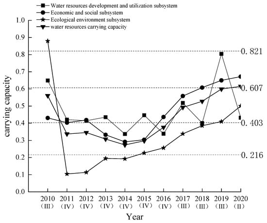 The grade criteria for water resource carrying capacity in Zhangye City are as follows: [0, 0.216) as grade V extreme level; [0.216, 0.403) as grade IV relatively poor level; [0.403, 0.607) as grade III medium level; [0.607, 0.821) as grade II. [0.821, 1] is a very high level of class I. Using the water resources carrying capacity TOPSIS model, the water resources carrying capacity closeness of the molecular system in Zhangye City from 2010 to 2020 was calculated Ti. The calculation results are shown in Figure 3.