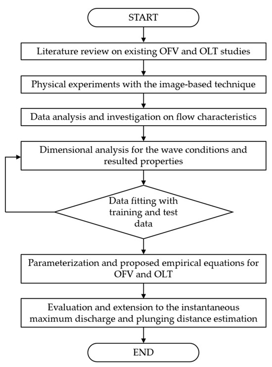 Equation (12) differs from the empirical equation we previously proposed in Adibhusana et al. [30]. In our prior study, we used only the relative crest freeboard as the estimator, while the OFV was normalized with the wave celerity, (). In this study, the normalized OFV yields a Froude number, which represents the ratio of inertia and gravitational force. The wave steepness and relative crest freeboard are employed as the estimators, leveraging these non-dimensional numbers that are widely used in wave overtopping studies. Additionally, OLT was not analyzed in our prior study [30]; we used the available empirical equation for dikes to estimate OLT [31]. Therefore, Equation (13) represents the new equation for estimating OLT on a composite breakwater. Figure 2 illustrates the procedure for evaluating the proposed Equations (12) and (13) in this study.