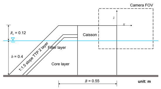 Dimensions of the composite breakwater used in this study. The dashed line shows the camera’s field of view (FOV).