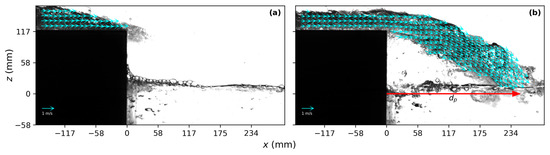 As previously indicated, the wave overtopping parameters, including the wave overtopping flow velocity, wave overtopping layer thickness, and wave overtopping plunging distance, were measured utilizing the BIV technique. Figure 5 shows an example of a wave overtopping velocity map. Figure 5a shows the wave overtopping reaching the rear edge of the breakwater. The wave overtopping flows are horizontally dominant, as indicated by the velocity vector. The depth-averaged horizontal velocity at the rear edge of the breakwater (i.e., at mm) was extracted from the velocity map. The overtopping layer thickness at this location was obtained by manually digitizing the water surface from the digital image [8]. The time series of both parameters are plotted in Figure 6. As depicted in Figure 6, the wave overtopping flow velocity experiences a rapid increase and eventually reaches its maximum value, which is denoted by a red marker in the plot. The overtopping layer thickness shows a similar pattern; however, the value gradually increases relatively, and the maximum occurs after the maximum overtopping flow velocity. In this study, the maximum velocity and layer thickness were used for the analysis in the next section. From Figure 5a, the sharp front of the overtopping flow can be observed, and the thickest layer follows right after the front. Figure 5b, at the moment right before the wave overtopping hits the water surface, also shows the thickest layer after the front. In Figure 5b, the horizontal distance between the middle of the plunging jet and rear caisson ( mm), as shown by the red line, was determined as the wave overtopping plunging distance . This parameter was also obtained by carefully digitizing the digital image to identify the midpoint of the plunging jet.