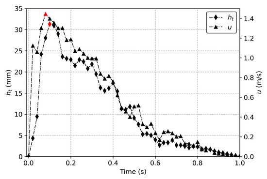 Time series of and at the rear edge of the breakwater. The red marker indicates the maximum and .