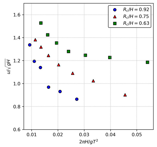 In this section, we conduct an analysis of the relationship between the dimensionless variables in Equation (12), using the experimental data for OFV (overtopping flow velocity) estimation. Figure 7 shows the distribution of the dimensionless wave overtopping flow velocity, , in different wave steepness levels, , and relative crest freeboard, . Figure 7 demonstrates that exhibits a linear relationship with and a power relationship with . The term signifies the vertical separation between the crest of the breakwater and the still water level. It acts as a limiting factor for wave overtopping, where higher values of relative crest freeboard result in reduced wave overtopping, and vice versa. This linear relationship was selected to account for the proportional impact of on the wave overtopping parameters. is a parameter indicative of the wave’s steepness and its potential for breaking, representing the ratio of to the wave period . As increases, waves are more prone to breaking. The power relationship was selected to capture this non-linear behavior, where the increase in leads to a significant change in the wave overtopping parameters. A similar pattern and relationship were also observed in other study [20].