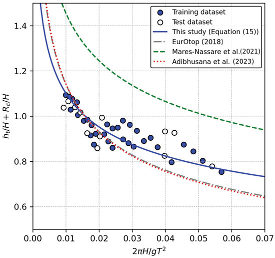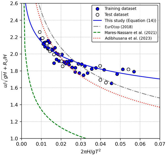 A comparison between empirical equations (this study Equation (15), EurOtop [5], Mares-Nassare et al. [20], and Adibhusana et al. [31]) for OLT estimation with the training and testing datasets.