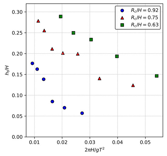 In this section, an investigation was carried out to determine the relationship between the dimensionless variables in Equation (13) using the experimental data for estimating the overtopping layer thickness (OLT). Figure 9 displays the distribution among the dimensionless OLT (), the wave steepness (), and the relative crest freeboard (). From Figure 9, it is evident that exhibits a linear relationship with and a power relationship with , similar to the OFV relationship. Based on this observation, Equation (15) is proposed as the empirical equation for OLT: