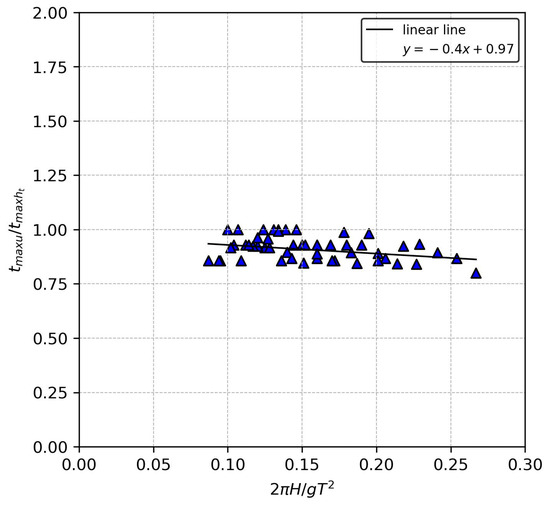 In extreme wave conditions, significant wave overtopping momentum can result from a large wave overtopping velocity and layer thickness, causing hazardous impacts over the breakwater crest. In this sub-section, the application of Equations (14) and (15) in the estimation of maximum instantaneous overtopping discharge is presented. Figure 11 illustrates the ratio of the occurrence of the maximum OFV (at ) and OLT (at ) in the present study. From the figure, it can be observed that occurred slightly earlier than . The average of is 0.914, and the gradient of the data in Figure 11 is 0.4. This indicates that the maximum OFV and OLT occurred almost at the same time. Based on this observation, we assume that the OFV and OLT occur at the same time by ignoring the time difference. Equation (16) is proposed to estimate the maximum instantaneous discharge () as the product of the OFV and OLT:
