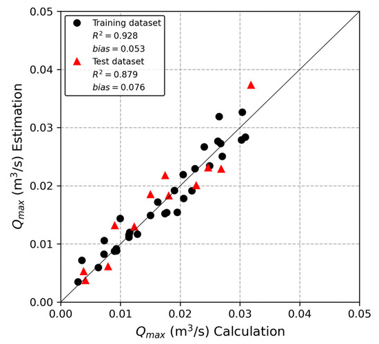 The calculated and estimated values are illustrated in Figure 12. The calculated value was obtained from the experimental data of and . In the estimated value, Equations (14) and (15) were used to estimate and . As shown in Figure 12, both the calculated and estimated values demonstrate a good agreement, with 0.928 and 0.053 for the training dataset, and 0.879 and 0.076 for the testing dataset.