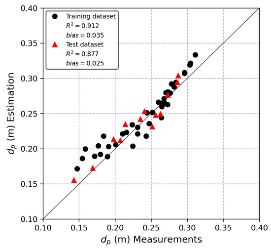 As depicted in Figure 8, Equation (14) aligns well qualitatively with both the training and testing datasets. Coefficients of determination () and relative bias () were used to evaluate the accuracy of the proposed empirical equation. A detailed explanation of these two equations can be found in Appendix B. A high agreement was observed with 0.955 and 0.001 between the training dataset and Equation (14). Similarly, in the testing dataset, a good agreement was obtained with 0.920 and 0.010. These results indicate that and are relevant variables for accurately estimating the OFV.