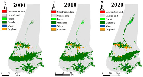 Figure 3 and Table 2 show the spatial and temporal changes in the composition of the six LULC types in the KRB. The overall change in the area of LULC types in the KRB from 2000 to 2020 is more obvious, with unused land and grassland being the most important land types, accounting for more than 78% and 19% of the total land area at all times, respectively, showing a gradually decreasing trend. Arable land, water catchment areas, forest areas, and construction areas generally show increasing trends. In 2000–2020, cropland area continued to increase, with the cropland area increasing by 354.88 km2 and the unused area increasing by 45.51 km2. During 2010–2020, construction land grew the fastest, with an expansion rate of 172%. The distribution of construction land is usually surrounded by cultivated land, which represents the main area of human activity and is subject to the most human intervention. The amount of undeveloped land and grassland will drop by 425.42 km2 and 51.43 km2, respectively, between 2000 and 2020, while the area of water will hardly change.