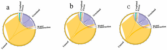 LULC transfer map of the KRB from 2000 to 2020. (a) 2000–2010; (b) 2010–2020; (c) 2000–2020.