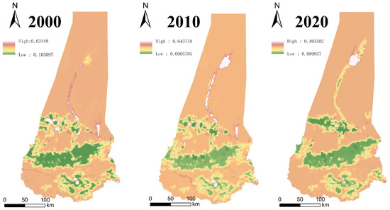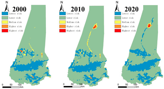 The LERI for the watershed had mean average values of 0.1721, 0.1714, and 0.1669 in 2000, 2010, and 2020, respectively. These values indicated a slight downward trend. Figure 5 shows that the LERI of the watershed had significant spatial and temporal variability. In the spatial distribution, the entire watershed was dominated by low and lower risks, while high and higher risks were mainly distributed along the Kriya River system, especially in the Daryaboyi, which are deep in the desert with sparse surrounding vegetation and poor natural conditions. The combined percentage of the study area’s total area that was made up of the lowest risk and the lower risk was approximately constant, making up 98.69%, 97.88%, and 99.18% in 2000, 2010, and 2020, respectively. In 2000, 2010, and 2020, the total of the highest and highest risks is 0.29%, 0.58%, and 0.44%, respectively, with a slightly expanding and fluctuating trend towards the Northern Desert Region.