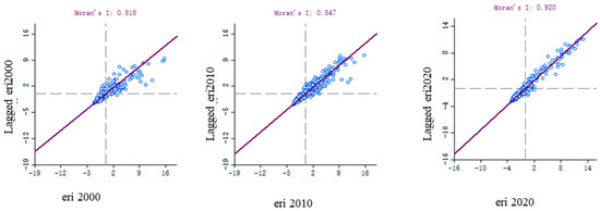 The ERI values in the KRB from 2000 to 2020 are shown in a scatter distribution of Moran’s I index.