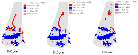 LER Moran’s I values are, respectively, 0.818, 0.847, and 0.920 from 2000 to 2020 (Figure 6), all greater than 0.5. This indicated that the LERI of the KRB over the past 20 years had a positive and significant spatial correlation; in addition, the scattered points were distributed close to the regression line, suggests that the distribution of LER is spatially clustered and that this spatial clustering increases over time.