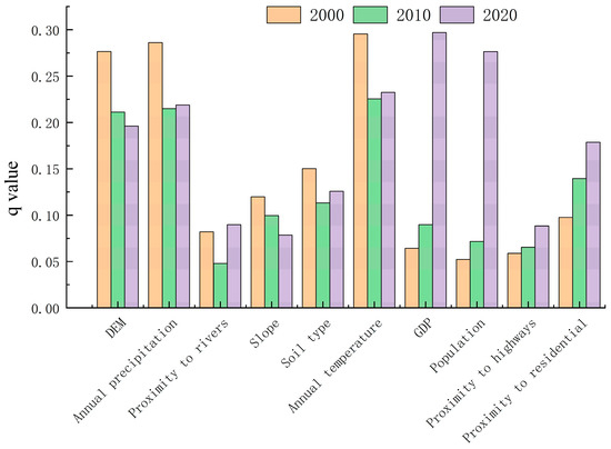 Based on factor detection, the LER of the KRB was examined with respect to the drivers for three periods from 2000 to 2020, and all factors passed the significance test (p < 0.01). Figure 8 displays the results of factor detection for each year. The LER of KRB is primarily driven by socioeconomic and natural condition factors, and each driving factor has a different contribution rate. For example, in 2000, soil conditions, annual temperature, precipitation, and DEM were the main influencing factors; in 2010, urban settlements, annual temperature, precipitation, and DEM were the dominant factors; and in 2020, GDP, population, annual temperature, and precipitation were the main influencing factors. According to the findings, environmental drivers will continue to have the greatest influence on the spatial distribution of LER through the year 2020, while social drivers’ influence will grow as society advances.