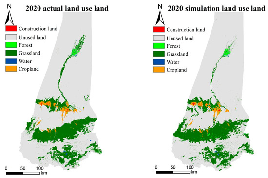 This study uses the 2010 LULC, driving factor data, and LULC extension analysis data as its raw inputs in order to keep the simulation error at a level that is reassuringly acceptable. By contrasting it with the predicted outcomes from the 2020 PLUS model, the accuracy of the spatial distribution of LULC in the study area for the year 2020 is assessed. The assessment of simulation accuracy in this article employs the Kappa coefficient and the Fom coefficient [35,58]. The kappa coefficient, which ranges from 0 to 1, is used to assess the consistency and accuracy of the simulation results. A value greater than 0.7 indicates a higher level of consistency and accuracy. Conversely, the FOM coefficient is computed as the ratio of the intersection of the projected and actual land changes to the total of the two. Higher values of this coefficient, which likewise has a range of 0 to 1, denote increased simulation accuracy [36,59].