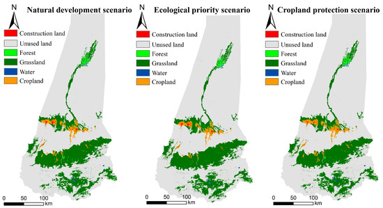 Figure 10 and Table 3 show the simulated LULC under different development scenarios for the year 2030, and they show different trends for each scenario for 2030 compared to the LULC for 2020. In accordance with Table 3, we can derive the following: (1) According to the NDS, compared to 2020, cropland, forest land, water, and construction land all increased. Forest land saw the largest increase, with a 92.83 km2 increase, while grassland and unused land areas decreased. The construction land change rate was 60.37%. (2) Within the framework of CPS, the primary focus was on the protection of cropland. In this context, cropland witnessed a substantial increase in area, with a growth of 156.02 km2 or 12.71%, representing the largest expansion among all types of land. The expansion of construction land, on the other hand, primarily resulted from the conversion of grassland and unused land. In comparison to the 2020 figures, the area of grassland decreased by 26.81 km2, while the amount of construction land remained relatively stable. (3) Under the EPS: all ecological land areas increased to different degrees, including forest land, which increased by 66.27 km2, and grassland, which increased by 132.48 km2, and the total area of ecological land reached 13,918 km2, which was the maximum area of ecological land under all scenarios.