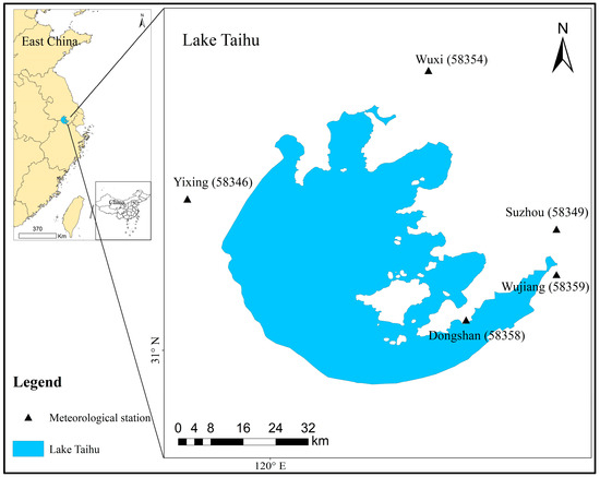 Location of Taihu Lake and surrounding national basic meteorological stations in China.