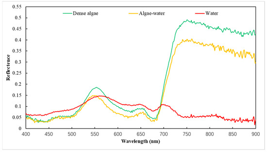 Field measurement reflectance spectra of dense algae, algae-water, and water in Lake Taihu. The spectra values were determined as the average spectra of the three types of observation targets [48].