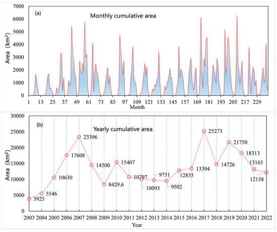 Monthly (a) and yearly (b) algal bloom cumulative areas in Lake Taihu from 2003 to 2022.