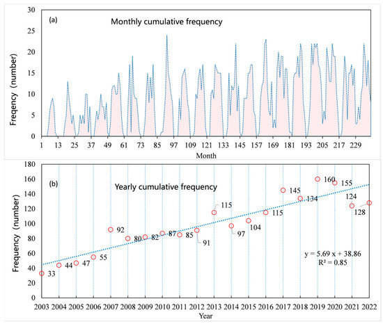 Monthly (a) and yearly (b) algal bloom cumulative frequencies in Lake Taihu during 2003–2022. The blue dotted line in Figure (b) is the trend line of the cumulative frequency.