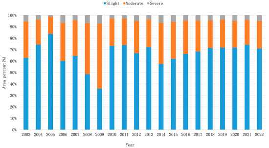Algal bloom area percentage at slight, moderate, and severe levels in Lake Taihu during 2003–2022.
