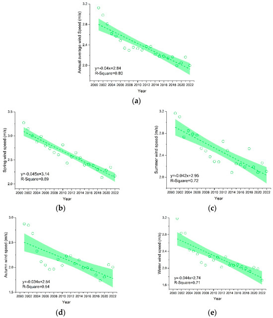 Mean wind speed variation in (a) year, (b) Spring, (c) Summer, (d) Autumn, and (e) Winter in the Lake Taihu area during 2001–2022. The shadows represent the 95% confidence interval of the linear regression trend line.