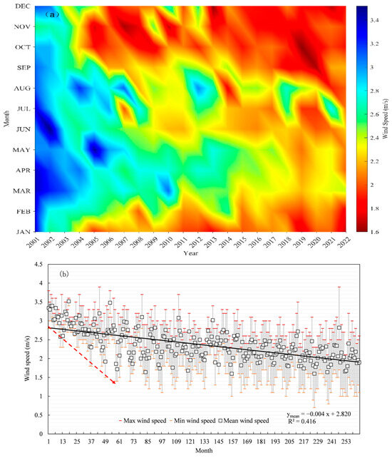Monthly mean wind speeds in the Lake Taihu area during 2001–2022. Figure (a) is the heat map of mean monthly wind speed, showing the decline tendency of wind speed in the past 20 years. The black solid line in Figure (b) is the trend line of monthly mean wind speed, while the red dashed line schematically represents the trend of monthly minimum wind speed during 2001–2006.